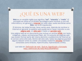 Este documento habla sobre el significado de la palabra "web" y sus diferentes usos. Define una página web como un documento HTML con texto, imágenes u otros medios, y un sitio web como un conjunto de páginas relacionadas bajo un mismo dominio con enlaces entre ellas. Finalmente, proporciona un enlace para más información sobre la definición de web.