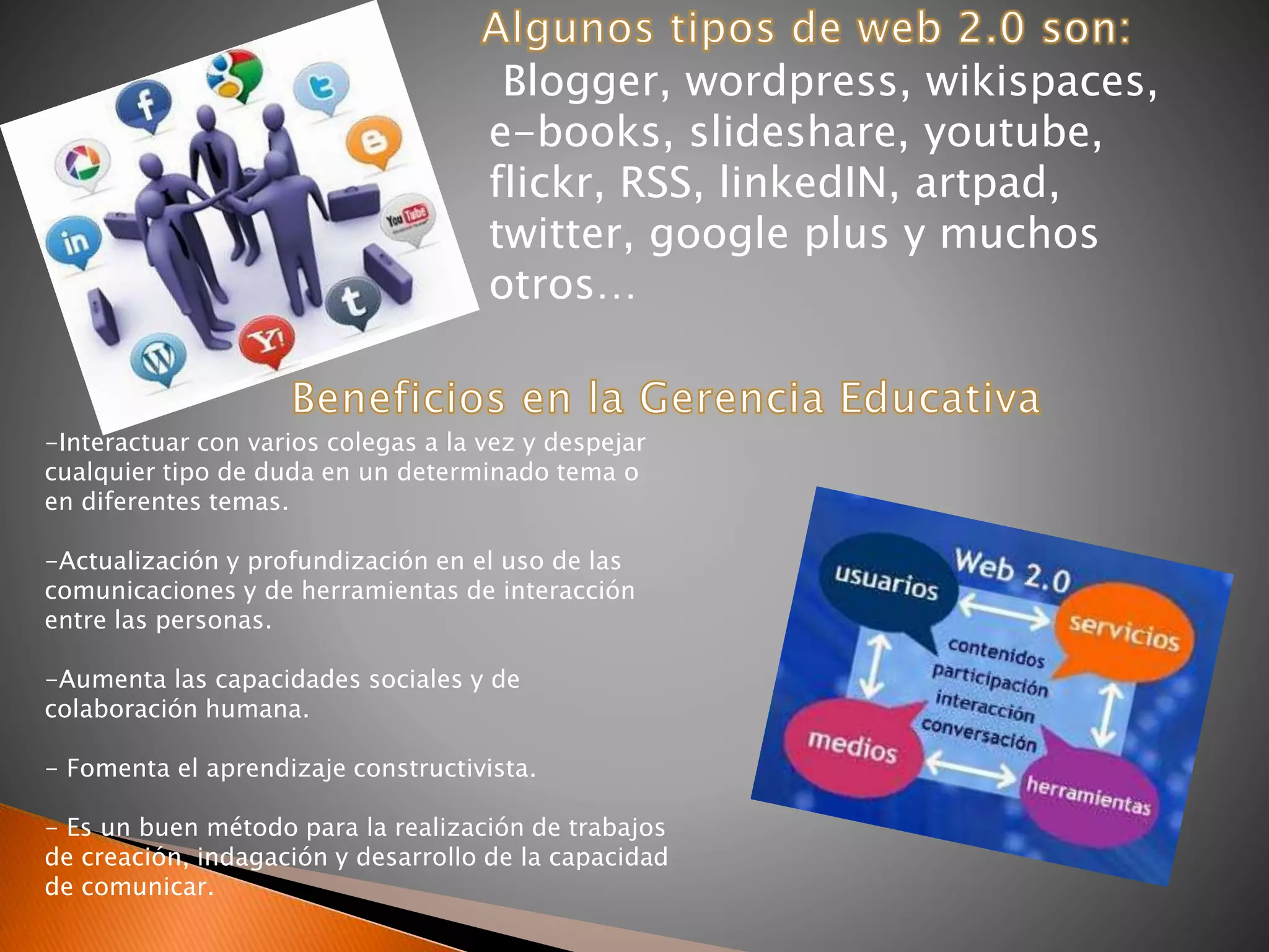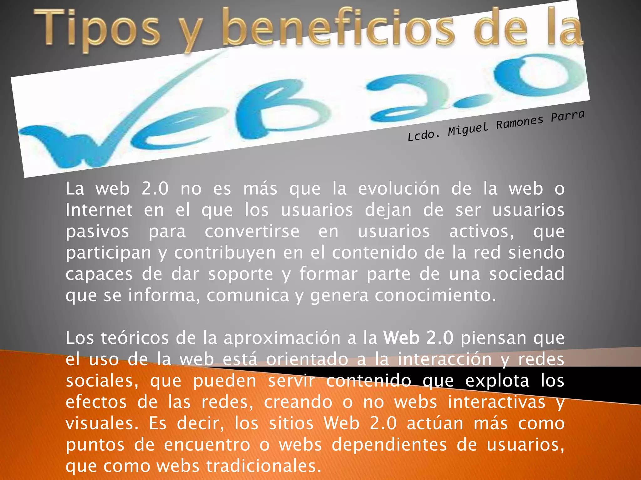 La Web 2.0 permite a los usuarios participar activamente en la creación y distribución de contenido en la web en lugar de ser solo consumidores pasivos. Esto incluye compartir información, conocimientos y recursos a través de redes sociales y plataformas interactivas. Los sitios Web 2.0 fomentan la interacción entre los usuarios y funcionan más como puntos de encuentro que como sitios web tradicionales.