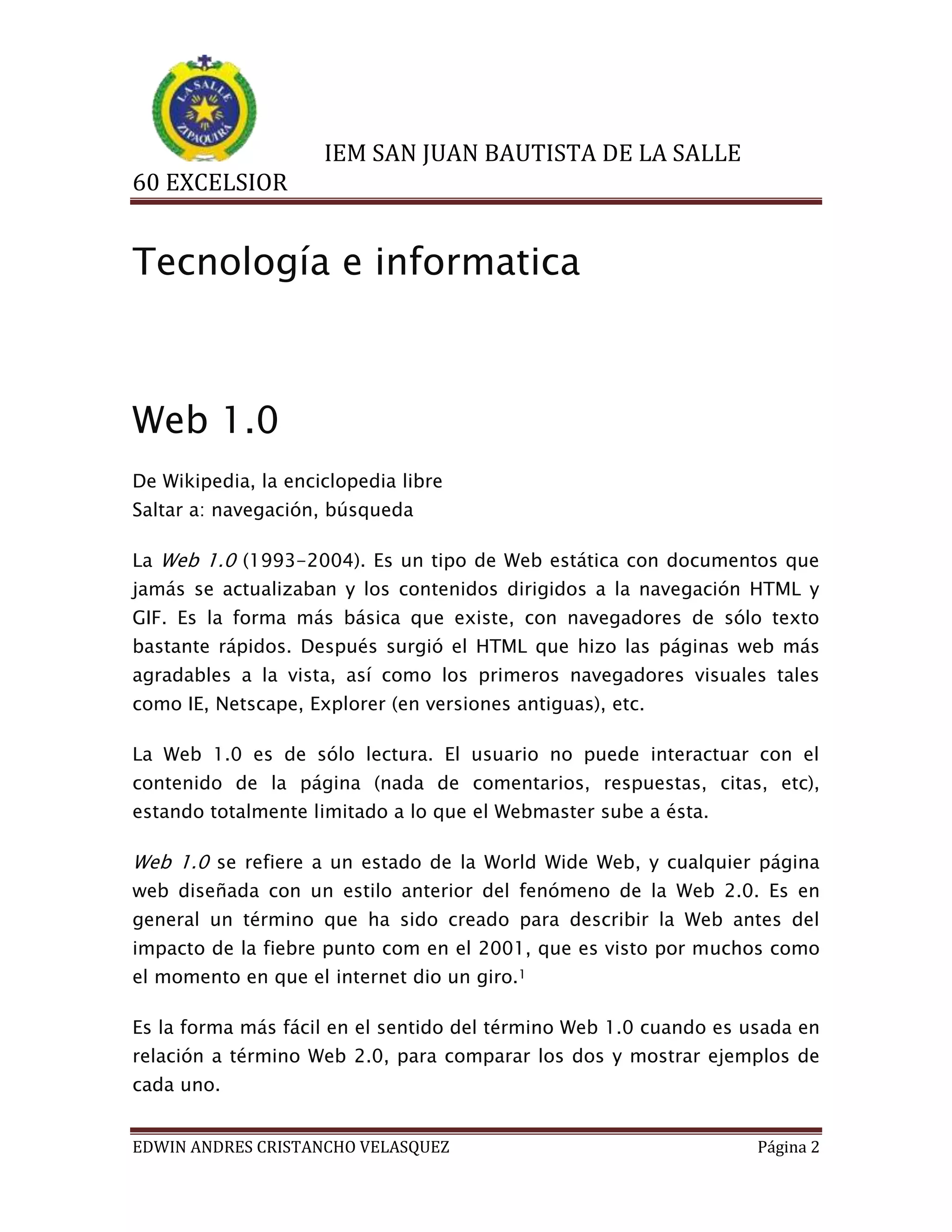 El documento describe las características de la Web 1.0 y la Web 2.0. La Web 1.0 se refiere a la primera etapa de la World Wide Web y consistía en páginas web estáticas con contenido creado por los desarrolladores que no podía ser modificado por los usuarios. La Web 2.0 introdujo sitios web más dinámicos y participativos donde los usuarios podían crear y compartir contenido a través de blogs, wikis, redes sociales y otros servicios.
