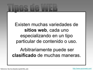 Existen diversas variedades de sitios web, que se clasifican según su contenido y propósito, incluyendo archivos, weblogs, microblogs, fotologs, videoblogs, y más. Cada tipo de sitio web tiene características específicas, como los sitios de comercio electrónico, de información, o de redes sociales, y están diseñados para facilitar interacciones o compartir contenido. Además, tecnologías como RSS y podcasting permiten la distribución y consumo de contenido multimedia de manera eficiente.