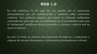 El documento describe las características de la Web 1.0, 2.0 y 3.0. La Web 1.0 se caracterizó por ser unidireccional y con contenidos estáticos. La Web 2.0 permitió la colaboración y contenidos dinámicos a través de blogs, wikis y redes sociales. La Web 3.0 es la web semántica basada en la nube que es accesible desde múltiples dispositivos.
