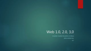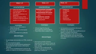 El documento describe las características y diferencias entre la web 1.0, 2.0 y 3.0, destacando aspectos como el control de datos, ventajas de exposición y desventajas relacionadas con la comunicación y privacidad. Se menciona que la web evoluciona hacia una mayor interactividad y distribución de información. También se aborda el impacto de la tecnología en la accesibilidad y gestión de contenido.