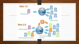 La web 1.0 era principalmente unidireccional y contenía información estática que no podía actualizarse fácilmente. La web 2.0 permitió el desarrollo de blogs, wikis, foros y redes sociales que fomentaron la compartición de conocimiento. La web 3.0 es la web semántica, basada en la nube y accesible desde múltiples dispositivos, que pretende ofrecer servicios inteligentes al usuario almacenando su información en la nube.