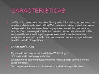 La Web 1.0 permitió a los usuarios navegar entre páginas web estáticas a través de hipervínculos. La Web 2.0 introdujo sitios web dinámicos generados por bases de datos que permiten a los usuarios controlar y compartir sus propios datos a través de redes sociales. La Web 3.0 se centra en la inteligencia artificial para crear redes semánticas que son inteligentes, sociales, rápidas, abiertas, ubicuas, fáciles de usar y tridimensionales.