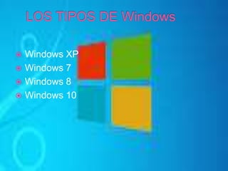 Este documento resume los principales tipos de sistemas operativos Windows, incluyendo Windows XP, 7, 8 y 10. Describe las ventajas e inconvenientes clave de cada uno. También analiza características como compatibilidad de hardware, seguridad, rendimiento y facilidad de uso. En general, los sistemas más recientes como Windows 10 ofrecen mayores ventajas en términos de velocidad, compatibilidad y experiencia de usuario, aunque presentan algunos inconvenientes iniciales menores como bugs y falta de compatibilidad con ciertas aplicaciones.