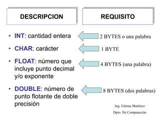 Este documento describe los diferentes tipos de datos básicos en C como enteros, caracteres, números de punto flotante y doble precisión, así como sus requisitos de almacenamiento y rangos. También explica los cualificadores como corto, largo y sin signo, y las reglas de conversión entre tipos de datos.