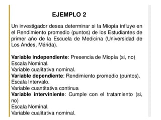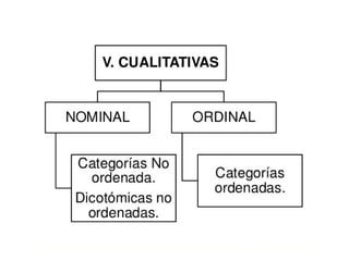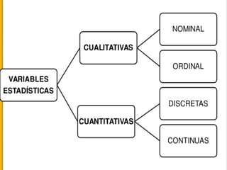 El documento describe tres tipos de variables estadísticas: variables cualitativas, que clasifican elementos en categorías; variables cuantitativas, que miden observaciones de forma numérica; y ejemplos de cada una como estado civil, estatura y número de pupitres.