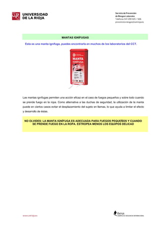 Este documento clasifica los diferentes tipos de fuego (clase A, B, C y D) según el material combustible involucrado (sólidos, líquidos inflamables, gases y metales combustibles). También describe brevemente los extintores de polvo y de CO2, indicando que los extintores de polvo son adecuados para la mayoría de los incendios mientras que los de CO2 son más apropiados para equipos delicados. Por último, presenta las mantas ignífugas como una alternativa a las duchas de seguridad para fuegos pequeños