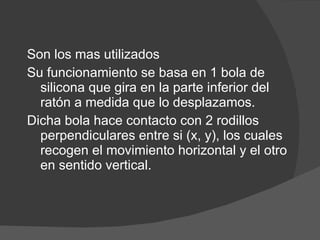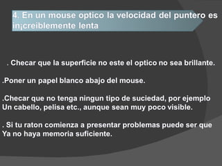 Este documento describe diferentes tipos de ratones, incluyendo ratones mecánicos, ópticos y de bola. Explica cómo funcionan mediante el uso de bolas, ruedas y sensores infrarrojos para detectar el movimiento y orientación. También identifica algunos problemas comunes con ratones y sus soluciones como actualizar controladores, limpiar componentes internos o probar el ratón en otro puerto o computadora.