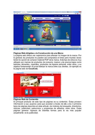 El documento describe los diferentes tipos de páginas web, incluyendo páginas transaccionales para comercio electrónico, páginas orientadas a servicios, páginas para construir una marca, páginas de contenido, comunidades y foros, blogs, y páginas institucionales. También explica los requisitos técnicos para crear una página web como hosting, dominios y programación.