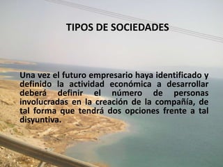 El documento describe los diferentes tipos de sociedades que pueden formarse para emprender un negocio, ya sea de manera individual o con otros socios. Las opciones incluyen constituirse como persona natural comerciante, empresa unipersonal, sociedad por acciones simplificada, sociedad limitada, sociedad colectiva, sociedad en comandita simple, sociedad anónima y sociedad en comandita por acciones. Cada tipo tiene diferentes requisitos en términos de responsabilidad de los socios y forma de administración.