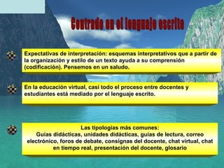 El documento describe diferentes tipos de material didáctico utilizados en entornos virtuales de educación, incluyendo guías didácticas, unidades didácticas, guías de lectura, correo electrónico y foros de debate. Explica que casi todo el proceso educativo entre docentes y estudiantes está mediado por el lenguaje escrito. Luego, proporciona detalles sobre el contenido y estructura recomendada para guías didácticas y unidades didácticas, así como consejos para la redacción de guías de lectura y el uso del