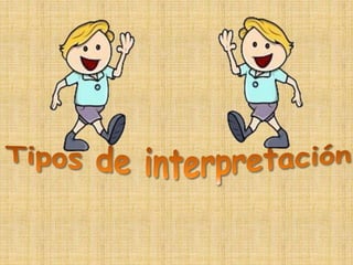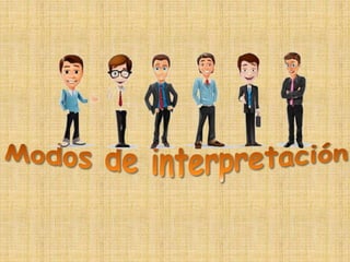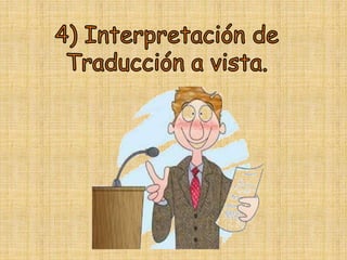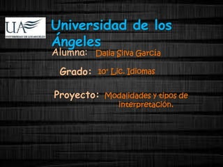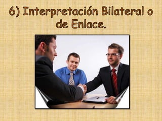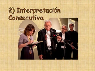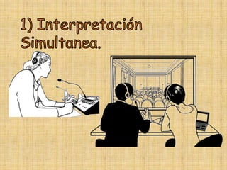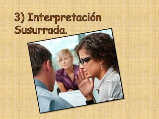Este documento presenta información sobre los tipos y modalidades de interpretación. Explica que los tipos de interpretación se definen por la técnica utilizada, como la interpretación simultánea o consecutiva. Las modalidades se definen por el evento y lugar, como la interpretación de conferencias o jurídica. Luego proporciona detalles sobre diferentes modos de interpretación, incluyendo requisitos y ejemplos de eventos para cada uno. El objetivo general es ayudar a los lectores a entender la diferencia entre los tipos y modalidades de interpretación.