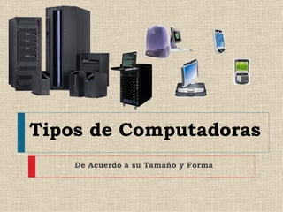 Este documento describe diferentes tipos de computadoras clasificadas por su tamaño y forma. Incluye supercomputadoras, macrocomputadoras, minicomputadoras, microcomputadoras personales como estaciones de trabajo, torres, portátiles, tabletas y teléfonos inteligentes. También cubre computadoras incrustadas en otros dispositivos como electrodomésticos, automóviles y consolas de juegos.