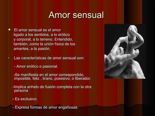 El documento resume diferentes tipos de amor, incluyendo el amor sensual (ligado a los sentidos y lo corporal), amor imposible (cuando sólo uno ama o es imposible por otras razones), amor idealizado (perfecto e inalcanzable), amor como liberación (huir de problemas a través del amor), amor tirano (que priva de libertad), amor recíproco (correspondido entre pareja) y amor filial (entre padres e hijos). Incluye poemas que ilustran cada tipo de amor.