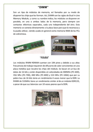 Este documento describe los diferentes tipos de módulos de memoria RAM, incluyendo DIMM, RIMM, DDR1, DDR2, DDR3 y DDR4. Explica las características clave de cada uno como su velocidad, ancho de banda, número de pines y si requieren disipadores de calor. Concluye que la memoria DDR4 es el estándar más moderno y ofrece mayores velocidades que la DDR3.