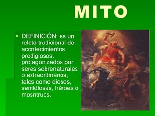 Los mitos son relatos tradicionales protagonizados por seres sobrenaturales que intentan explicar fenómenos del mundo. Existen varios tipos de mitos como los cosmogónicos que explican la creación del mundo, los teogónicos sobre el origen de los dioses, los antropogónicos sobre el origen del ser humano y los etiológicos que explican el origen de cosas y costumbres. También existen mitos fundacionales sobre el origen de ciudades y mitos escatológicos sobre el fin del mundo.