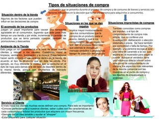 Este documento describe diferentes tipos de situaciones que influyen en el comportamiento del consumidor, incluyendo situaciones de compra, consumo, comunicación e información. Detalla factores como el ambiente de la tienda, el servicio al cliente, las creencias y actitudes, los hábitos de compra, la búsqueda de variedad y la reducción de la disonancia cognitiva que afectan las decisiones del consumidor. También examina cómo el estado de ánimo y el contexto afectan la exposición del consumidor a la información y comunicaciones de marketing.