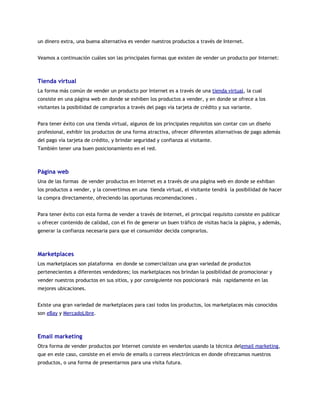 El documento describe diferentes formas de vender productos en línea, incluyendo tiendas virtuales, páginas web, marketplaces y correo electrónico. También presenta la filosofía y servicios de una tienda de mascotas llamada Happy Pet, la cual ofrece productos y servicios veterinarios para perros, gatos, aves, reptiles, anfibios y peces.