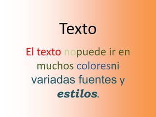 El documento proporciona recomendaciones para crear presentaciones visuales efectivas, incluyendo limitar el uso de varios colores, fuentes y estilos en el texto; usar tamaños de fuente adecuados; como máximo 3 tipos de fuente; escribir en minúsculas con la primera letra en mayúscula; contrastar colores claros y oscuros; limitar la cantidad y mejorar la calidad de imágenes; jerarquizar la información de manera ordenada; y limitar ideas y efectos para mantener la simplicidad. En resumen, recomi