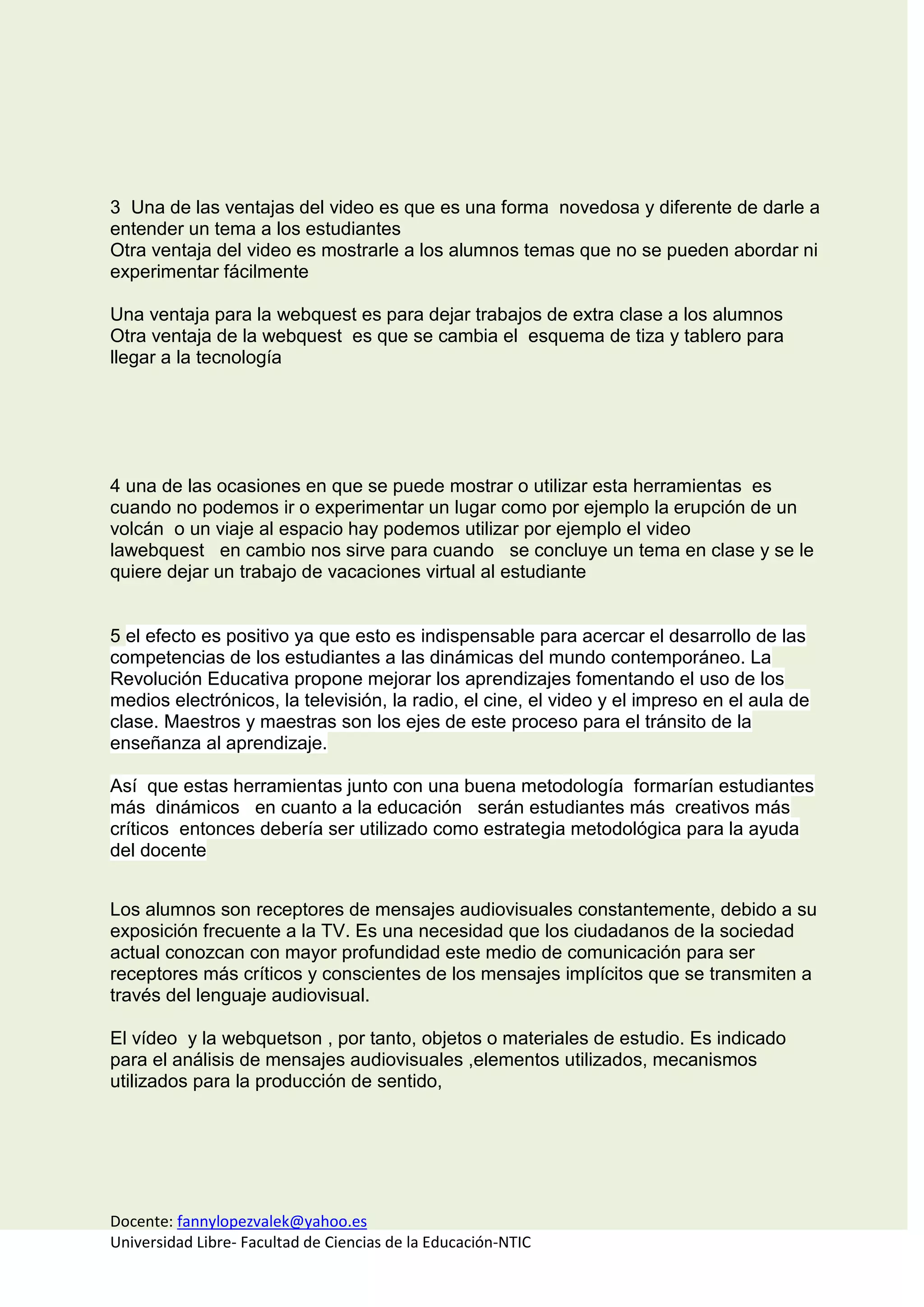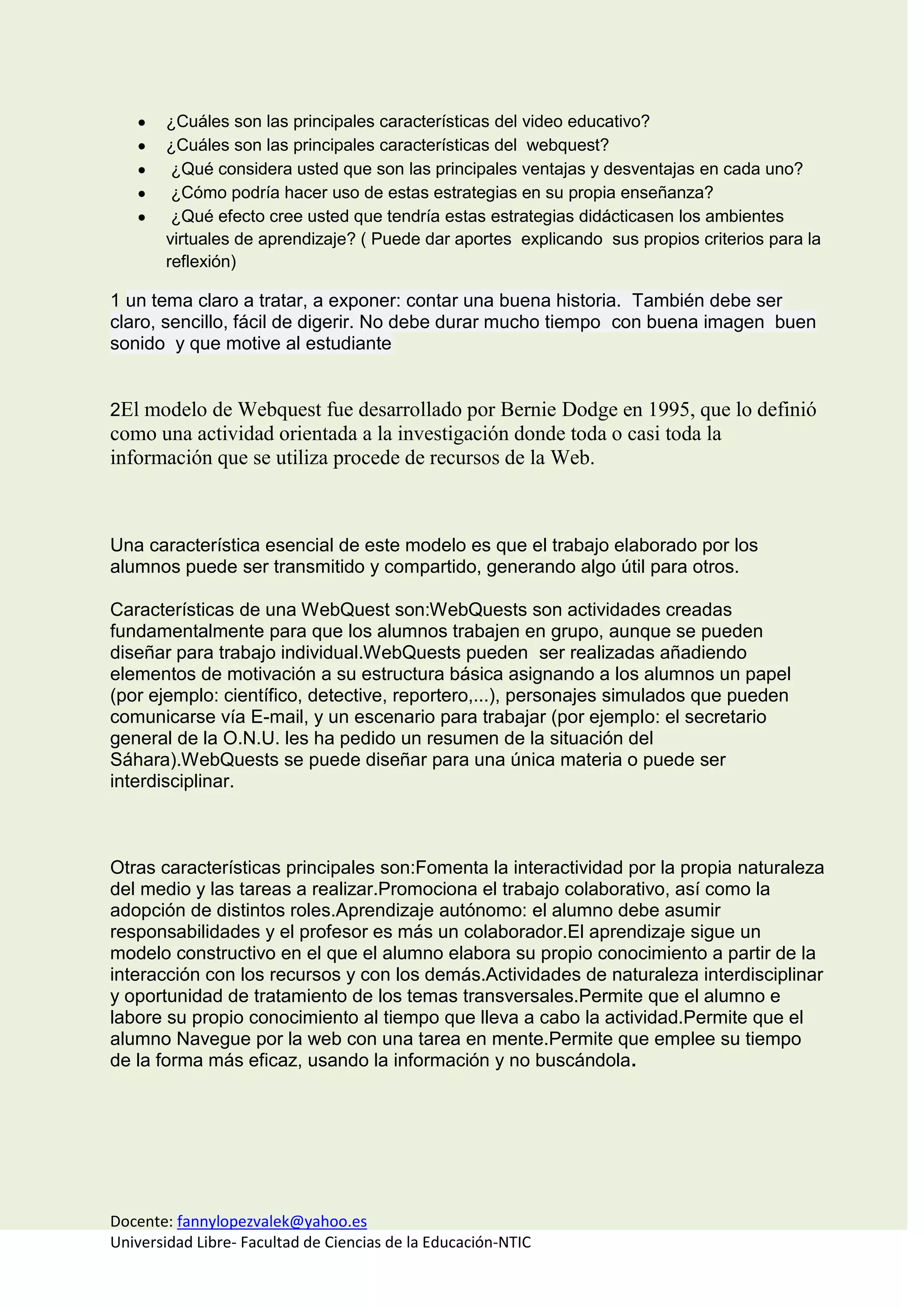 1. El video educativo permite mostrar temas de forma novedosa que no se pueden abordar fácilmente en clase, mientras que la webquest sirve para dejar trabajos extraclase.