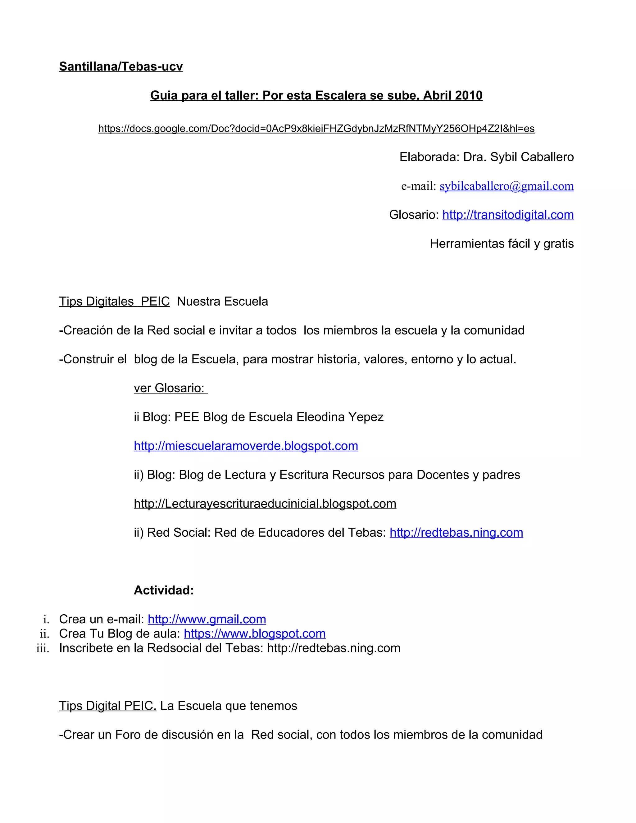Este documento proporciona una guía para un taller titulado "Por esta Escalera se sube" elaborado por la Dra. Sybil Caballero. Incluye consejos digitales (tips) para maestros sobre cómo crear redes sociales, blogs, foros de discusión y usar otras herramientas digitales para mejorar la comunicación entre la escuela y la comunidad. También incluye actividades prácticas que los maestros y estudiantes pueden realizar utilizando estas herramientas.