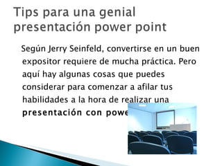 El documento proporciona consejos para mejorar las habilidades de presentación, incluyendo hablar más despacio, mantener el contacto visual con la audiencia, contar historias para transmitir las ideas de una manera emocional, y practicar con regularidad para ganar confianza.
