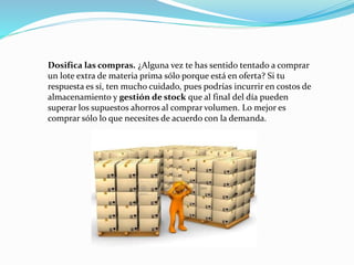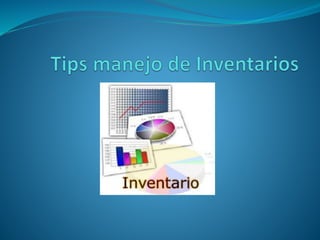 El documento ofrece consejos sobre la gestión eficiente de inventarios. Recomienda comprar sólo la cantidad necesaria de acuerdo con la demanda para evitar costos de almacenamiento y gestión innecesarios. También sugiere mantener niveles de inventario regulados por la demanda del mercado en lugar de excesivos para evitar gastos ociosos. Además, aconseja conocer los costos detallados de almacenamiento e implementar herramientas tecnológicas de gestión como ERP para administrar inventarios a medida que crece la empresa