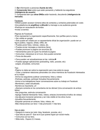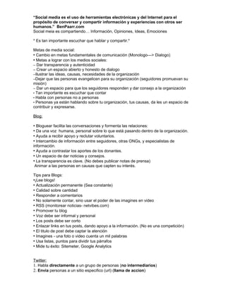 Este documento ofrece orientación sobre el uso de las redes sociales para organizaciones sin fines de lucro. Explica que las redes sociales permiten compartir información e ideas con otros de manera interactiva. Recomienda que las organizaciones usen blogs, Twitter y Facebook para ser transparentes, promover el diálogo abierto y permitir que los seguidores ayuden a difundir su misión. También proporciona consejos sobre cómo administrar páginas en estas plataformas de manera efectiva.