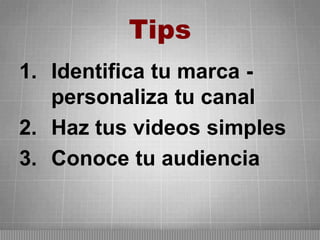 Este documento ofrece consejos para usar YouTube para los negocios. Recomienda identificar la marca personalizando el canal, hacer videos simples y conocer a la audiencia. También destaca los beneficios de promover la marca a través de contenido viral en YouTube.