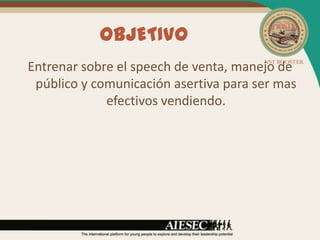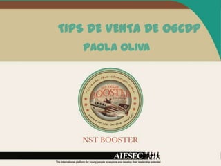 Este documento presenta una capacitación sobre técnicas de venta efectivas para el programa de oGCDP. La capacitación cubre temas como el discurso de ventas, el manejo de público y la comunicación asertiva. También incluye consejos prácticos sobre cómo vender el programa a través de ferias, sesiones informativas y reuniones con padres. El objetivo es entrenar a los vendedores para que puedan promover con éxito las oportunidades de oGCDP.
