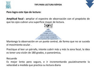 Este documento ofrece varios tips para mejorar la lectura rápida, incluyendo aumentar el tiempo de lectura diario, mantener un diccionario a mano para mejorar el léxico, relacionar palabras con imágenes para ampliar la memoria, eliminar la sub-vocalización al leer, ampliar la focal visual, saltar entre grupos pequeños de palabras al leer, y requerir mucha práctica constante.