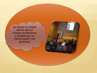 El documento describe la creación de un instituto de enseñanza para trabajadores en Colombia. Luego de un debate y aprobación por un comité asesor, el instituto brindaría formación a jóvenes y adultos a través de enseñanza teórica y práctica, aunque las primeras clases fueron difíciles. El instituto, llamado SENA, busca capacitar técnicamente a la fuerza laboral y vincular personas al mercado laboral mediante la formación y el desarrollo empresarial.