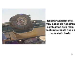 El documento describe la importancia de la seguridad de los neumáticos y proporciona información sobre su cuidado y mantenimiento. Explica que los neumáticos caducan después de 4 años y cómo encontrar la fecha de fabricación. También cubre la presión de inflado adecuada, la carga máxima, el tamaño y otras especificaciones importantes de los neumáticos. El objetivo final es crear conciencia sobre el cuidado de los neumáticos para garantizar la seguridad del vehículo.