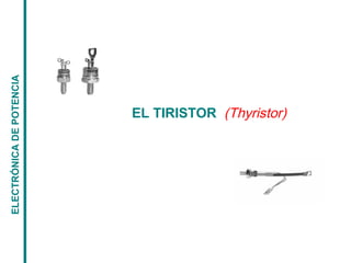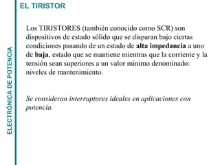 El documento describe los tiristores, dispositivos de estado sólido que se utilizan como interruptores ideales en aplicaciones de potencia. Son dispositivos de cuatro capas p-n alternadas que pueden soportar altas corrientes y tensiones, y su encendido se controla mediante una corriente de puerta. Se mencionan varios tipos como el SCR, TRIAC y DIAC, y sus características principales.