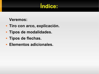 El documento describe el tiro con arco, incluyendo una breve historia, los tipos principales de modalidades y competiciones, los diferentes tipos de arcos y flechas, y los elementos adicionales comunes como la dragonera, dactilera y protectores. Explica que el tiro con arco se originó como arma de caza y guerra y ahora es principalmente un deporte de precisión que requiere control mental y físico.