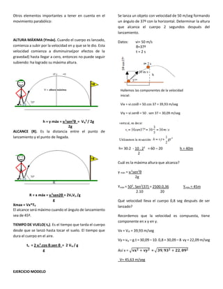 El movimiento parabólico es un movimiento compuesto por una componente vertical y otra horizontal. Se origina cuando un cuerpo es lanzado con una velocidad inicial que forma un ángulo con la horizontal, dándole dos componentes de velocidad. La aceleración solo actúa sobre el movimiento vertical, dirigida hacia abajo por la gravedad, mientras que la componente horizontal de la velocidad se mantiene constante.