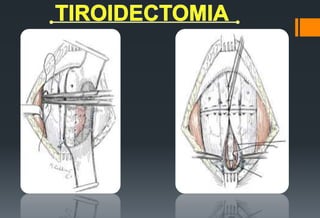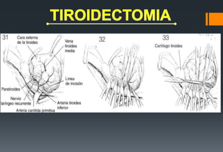Este documento describe los pasos de una tiroidectomía. Incluye 1) inducción de anestesia general, 2) colocación del paciente en posición semi-Fowler, 3) antisepsia y colocación de campos quirúrgicos, 4) realización de una incisión transversal en el cuello, y 5) preparación de colgajos subcutáneos y musculares. También proporciona detalles sobre la instrumentación quirúrgica requerida y las acciones de enfermería en cada paso del procedimiento.