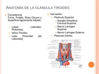 Este documento describe la anatomía y fisiología de la glándula tiroides, así como los síntomas, diagnóstico y tratamiento del hipotiroidismo y la hipertiroidismo. Incluye detalles sobre el coma mixedematoso, una emergencia médica causada por un déficit severo de hormona tiroidea, y discute el tratamiento con hormonas tiroideas. También cubre la tirotóxicosis, o crisis de hipertiroidismo, y los enfoques farmacológicos para reducir la síntesis y liberación de horm