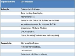Este documento describe varias patologías de la tiroides, incluyendo su anatomía, función, irrigación e inervación. Explica las causas del hipotiroidismo como la enfermedad de Hashimoto y del hipertiroidismo como la enfermedad de Graves. También describe diferentes tipos de tiroiditis como la aguda, subaguda y crónica, así como el bocio endémico y el hipotiroidismo yódico.