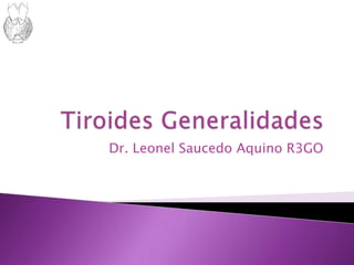 El documento describe la anatomía, fisiología e inervación de la glándula tiroides. Explica cómo las células de la tiroides captan yodo y lo usan para sintetizar las hormonas tiroideas T3 y T4 a partir de la proteína tiroglobulina. Las hormonas se liberan luego al torrente sanguíneo, donde son transportadas principalmente por proteínas, y afectan funciones en todo el cuerpo.