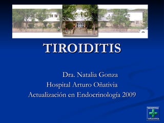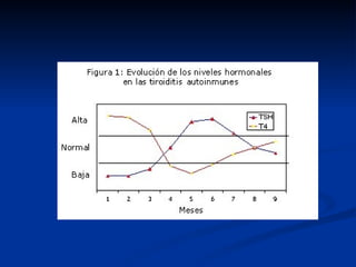 El documento resume los diferentes tipos de tiroiditis agudas, subagudas y crónicas. Las agudas pueden ser infecciosas o autoinmunes y se tratan con antibióticos o drenaje. Las subagudas incluyen la granulomatosa viral y la linfocítica esporádica o posparto. Las crónicas son la fibrosade de Riedel y la de Hashimoto, la más común, la cual puede causar hipotiroidismo.