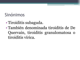La tiroiditis subaguda es una inflamación de la glándula tiroides causada principalmente por una infección viral de las vías respiratorias superiores. Se caracteriza por una fase inicial destructiva donde se liberan hormonas tiroideas, seguida de una fase de hipotiroidismo. Los síntomas suelen remitir espontáneamente en unos meses, aunque en ocasiones puede causar hipotiroidismo permanente. El tratamiento consiste principalmente en antiinflamatorios y, en casos graves, corticosteroides.