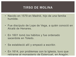 Este documento resume la vida y obra del dramaturgo español Tirso de Molina. Nació en 1579 en Madrid y fue discípulo de Lope de Vega. En 1601 se ordenó sacerdote y escribió obras teatrales en Toledo y otros lugares. Sus obras incluyen comedias religiosas, históricas, de enredo y tragicomedias. Su obra más famosa es El burlador de Sevilla, que popularizó el mito de Don Juan y ha tenido gran influencia en la literatura y música posteriores.