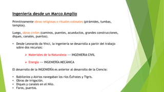 El documento describe la evolución de la ingeniería a través de la historia y las diferencias entre la ciencia y la ingeniería. La ingeniería se originó en las obras religiosas y civiles de la antigüedad y se desarrolló a partir del trabajo sobre materiales naturales e ingeniería mecánica. Mientras que los científicos buscan conocer lo que existe en la naturaleza, los ingenieros crean cosas nuevas para satisfacer las necesidades humanas aplicando conocimientos científicos. La ingeniería no es simplemente la
