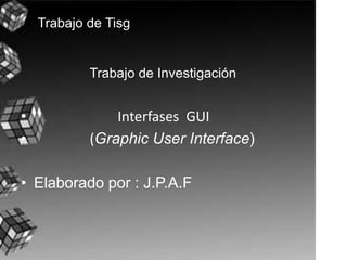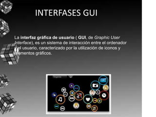 Este documento describe las interfaces gráficas de usuario (GUI), incluyendo los tipos principales (interfaz back-end, interfaz de red, interfaz front-end), sus características (ventanas, iconos, menús, apuntador, gráficos) y dónde se utilizan comúnmente (sistemas operativos como Apple, Windows, Linux).