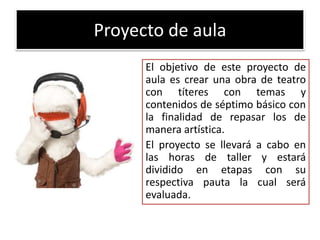 Este proyecto de aula tiene como objetivo crear una obra de teatro con títeres para repasar contenidos de séptimo básico. El proyecto se desarrollará en 7 clases divididas en etapas como la confección de títeres, creación del guion, ensayos y presentación de la obra. Los estudiantes serán evaluados en cada etapa considerando aspectos como la expresión oral, coherencia de la obra, coordinación, representación de los personajes y participación.
