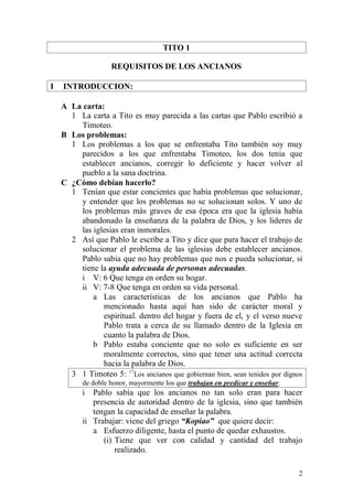 Este documento describe los requisitos para los ancianos de la iglesia según la carta de Pablo a Tito. Pablo dice que los ancianos deben tener su hogar y vida personal en orden, y sobre todo deben amar, estudiar, entender y vivir la palabra de Dios. Esto es necesario para que puedan enseñar e instruir al pueblo de Dios, y también para que puedan exhortar a los creyentes y convencer a los que contradicen la enseñanza bíblica. El anciano no debe cambiar el mensaje de la Biblia