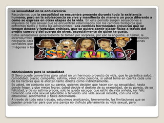 Este documento trata sobre la sexualidad en la adolescencia. En 3 oraciones: