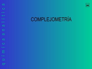 Este documento trata sobre la complejometría. Explica las curvas de titulación, cómo construirlas y calcular el punto de equivalencia. Incluye ejemplos de curvas de titulación para determinar calcio y cinc con EDTA usando indicadores metalocrómicos como el negro de eriocromo T.